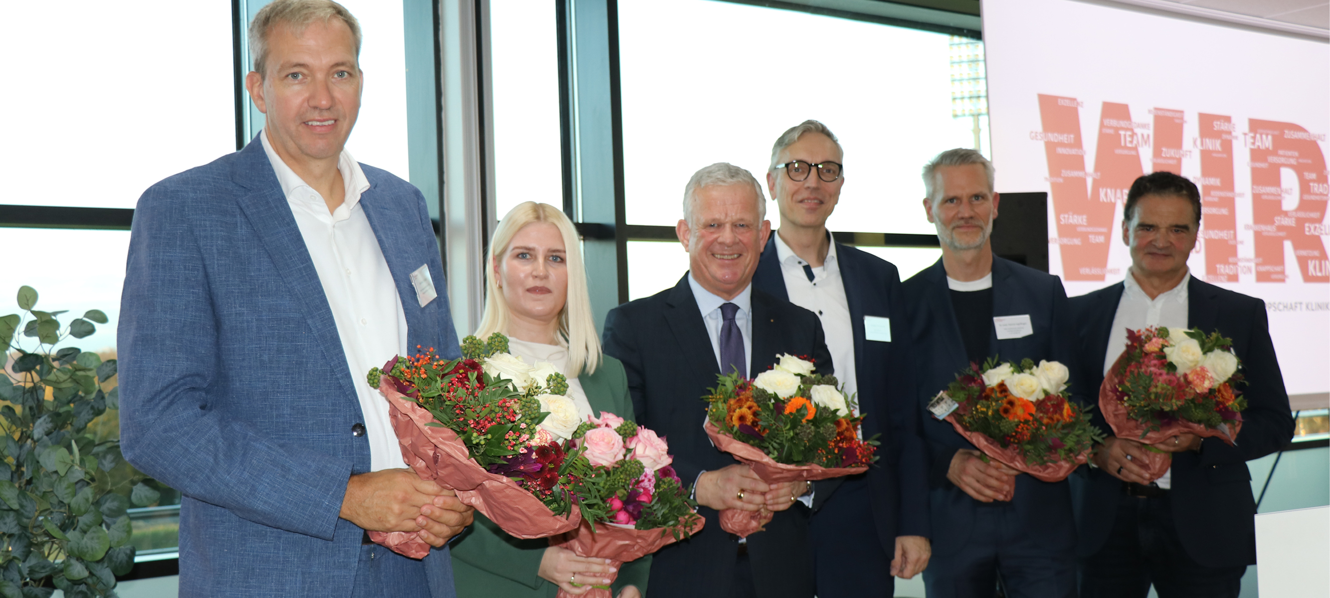 Von links nach rechts: Andreas Schlüter - Erster Hauptgeschäftsführer Knappschaft Kliniken, Kristina Mundt - Schulleiterin der Knappschaft Kliniken Akademie, Nicolaus Phillip Hüssen – Geschäftsführer medicos.AufSchalke, Matthias Dieckerhoff - Geschäftsführer Knappschaft Kliniken Akademie, Dr. Patrick Ingelfinger - Orthopädie.AufSchalke, Prof. Dr. Karl-Heinz Bauer - ehem. ärztlicher Direktor Knappschaft Kliniken Westfalen