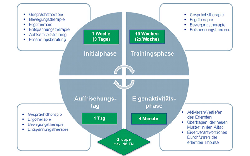 Eine Präventionsmaßnahme ist eine gute Option, eine psychische Erkrankung zu vermeiden. Besteht bereits eine gering ausgeprägte psychische Symptomatik, bietet eine Präventionsmaßnahme eine gute Möglichkeit, den Krankheitsverlauf positiv zu beeinflussen. Das Ziel sollte es immer sein, einen vorbeugenden – oder bei bereits bestehender Symptomatik – einen positiven Einfluss auf den Krankheitsverlauf zu nehmen. Psychosomatische Prävention erfolgt berufsbegleitend. Hierdurch kann in der Therapie Erlerntes unmittelbar in der Praxis, also auch am Arbeitsplatz, erprobt und weiterentwickelt werden. So ist die Barriere zwischen Rehabilitationseinrichtung und die Übertragung auf den Arbeitsplatz und das private Umfeld geringer. Umgekehrt können ebenso Themen aus dem beruflichen oder privaten Bereich kurzfristig therapeutisch begleitet werden. In der mehrmonatigen ambulanten Maßnahme kommen die Teilnehmer phasenweise in Gruppe zusammen. Die maximale Gruppenstärke beträgt hier 12 Personen.